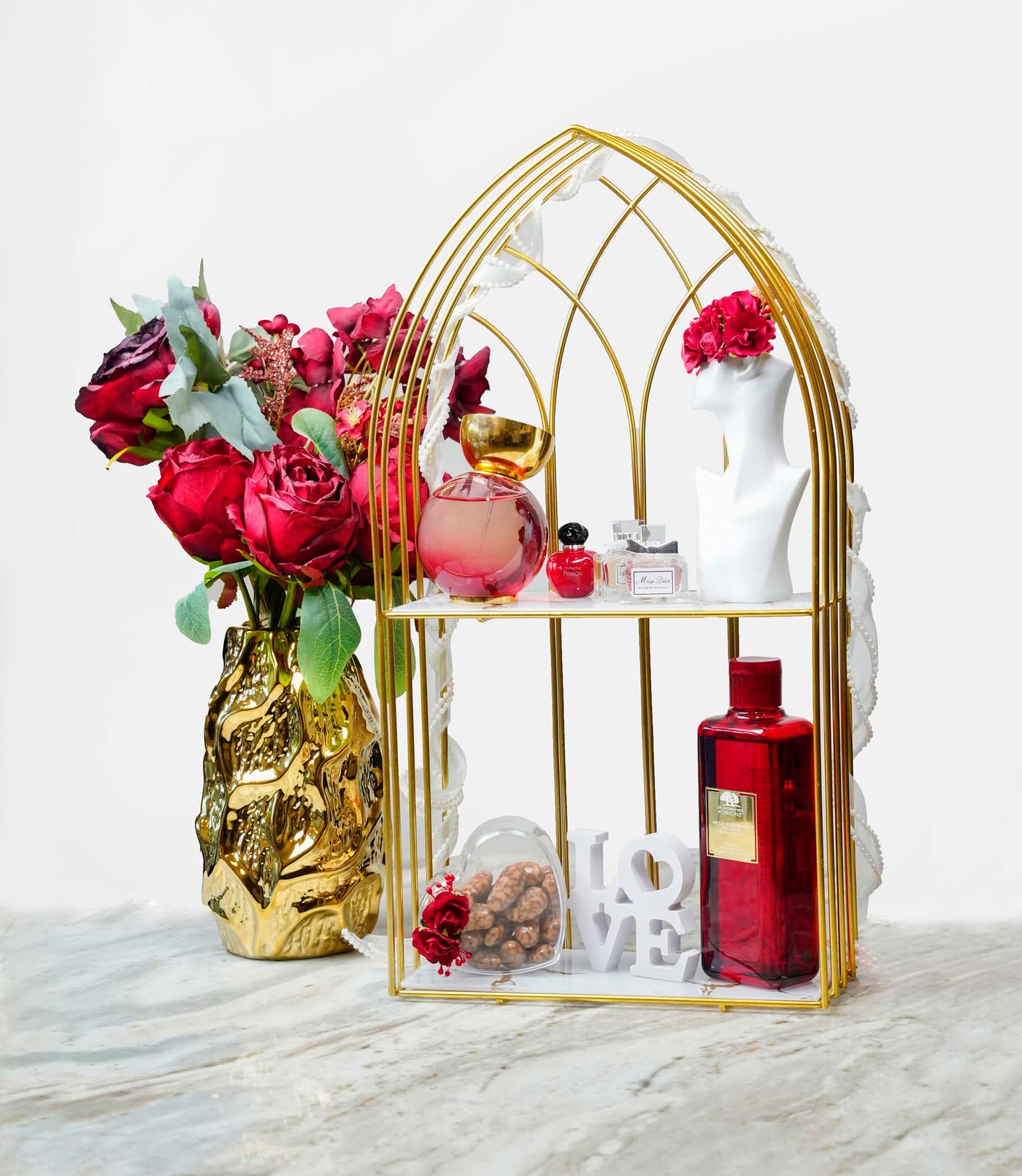 Radiating luxury and charm, this exquisite gift parcel features a golden stand adorned with a premium perfume, mini scents, Dr. Andrew Weil’s Origins Mega Mushroom Relief & Resilience lotion, and a heart-shaped box of chocolates & jewelry of your choice —crafted to impress and delight.