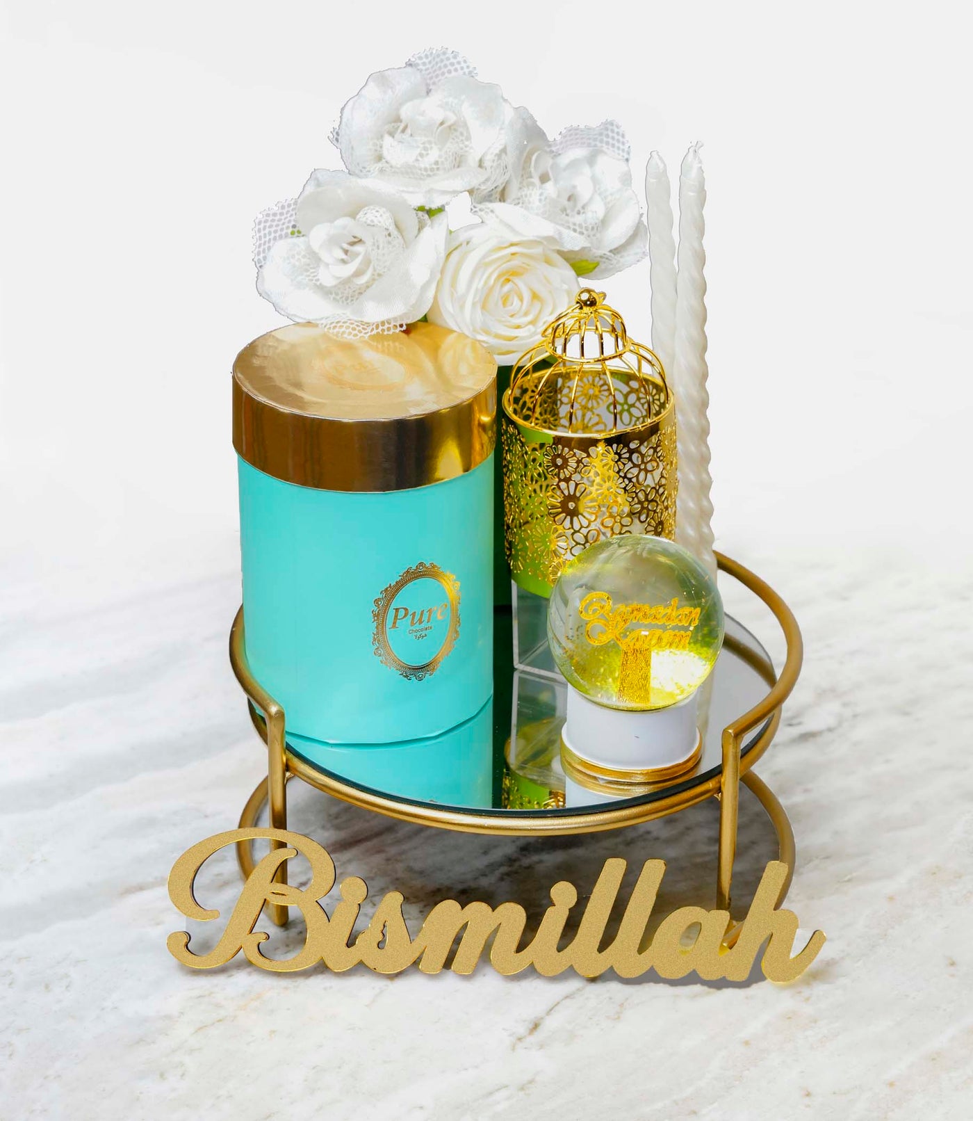 Date chocolates, Ramadan Kareem Globe, Gold lantern, White flowers