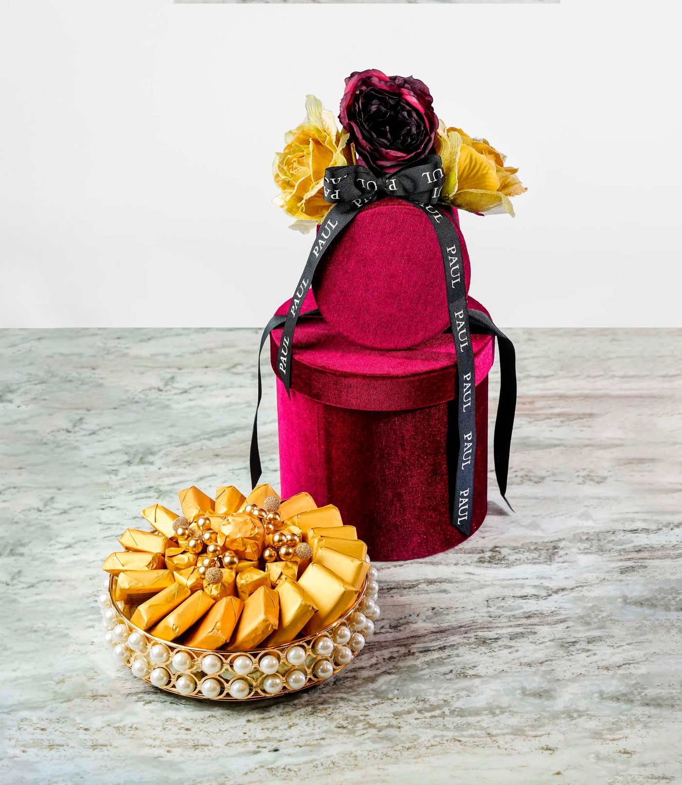 Celebrate love with this luxurious maroon velvet box set, designed for weddings and special occasions. Elegantly holds personalized gifts, premium chocolates, and fresh flowers. The rich velvet finish exudes sophistication, making it a timeless keepsake for couples and unforgettable celebrations.
