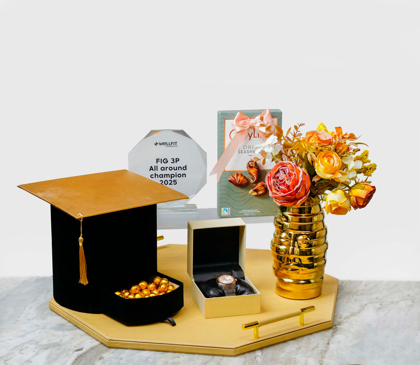 Big wins deserve big vibes! This graduation gift tray brings the glam with a Grad Cap box packed with chocolates, a premium watch, golden vase with flowers, and a glass trophy—because every milestone deserves to be celebrated in style!